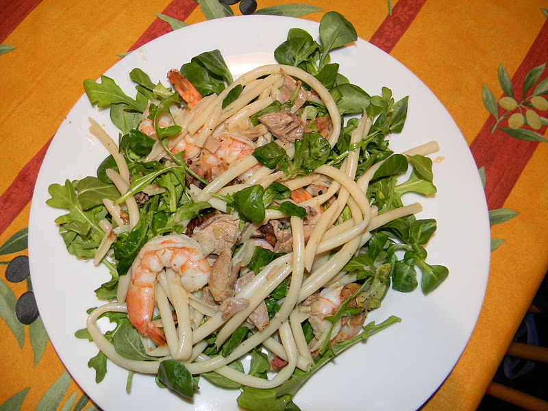 Dad's leftover Pasta with Duck L'Orange, Shrimp, Garlic, and White Wine.